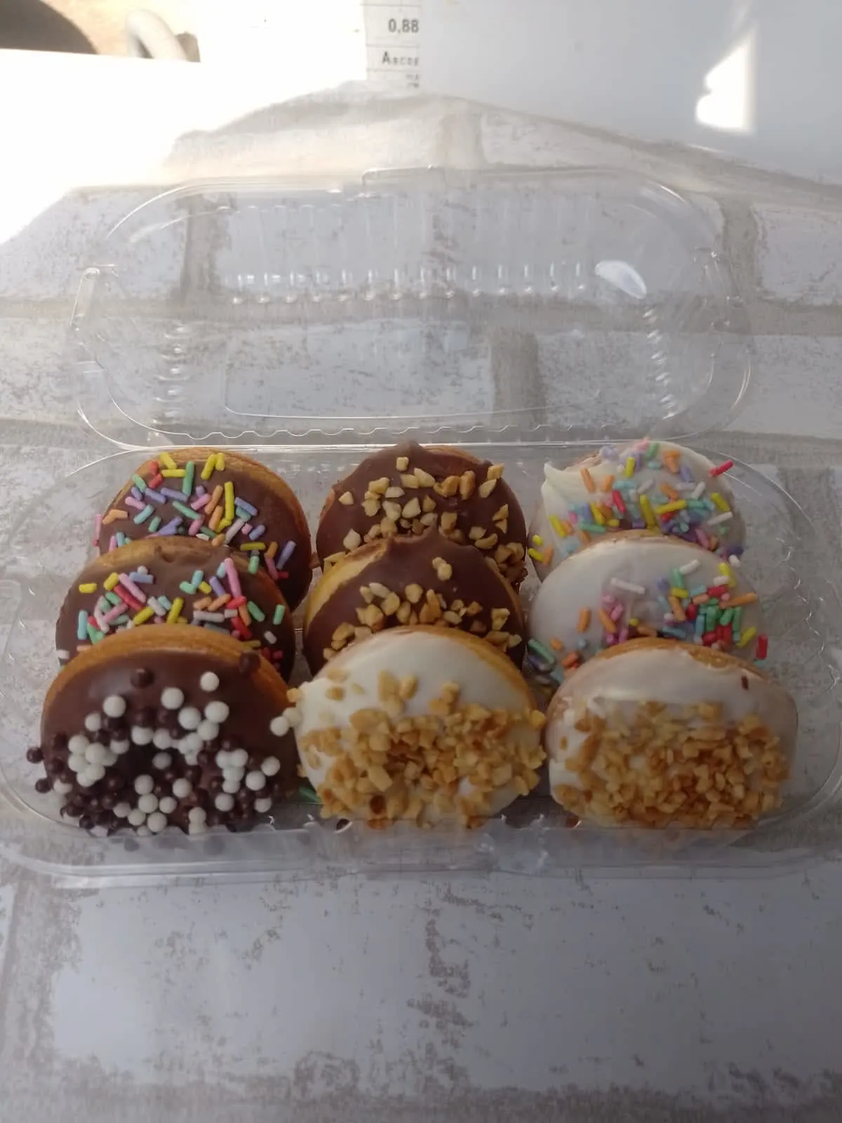 Escolha o sabor da massa do cake donuts e chocolate e o granulado da sua preferência.