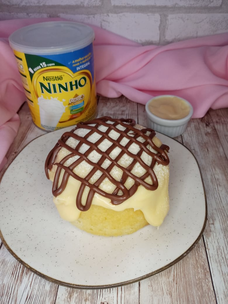 Bolo de massa branca fofinha bem molhadinho, com creme de avelã no meio com um recheio branco cremoso quentinho em cima, finalizando com creme de avelã e um morango.