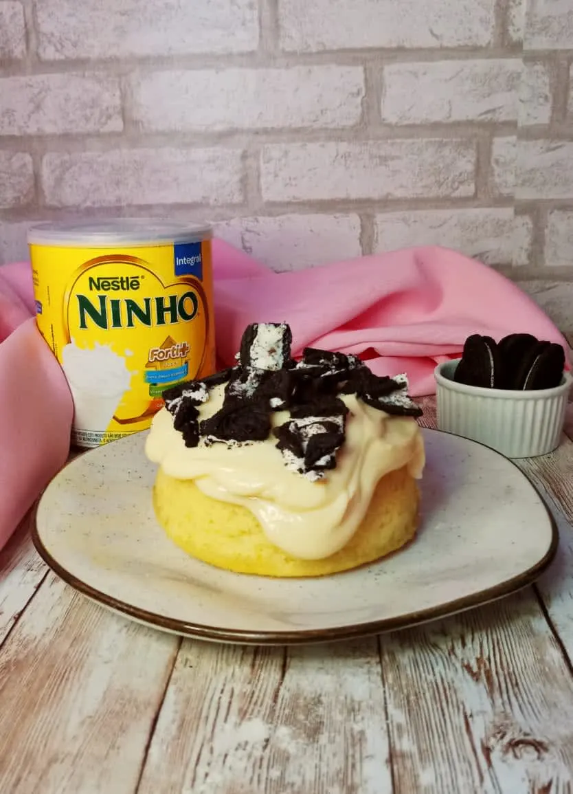 Bolo de massa branca fofinha bem molhadinho, com biscoito oreo quebrado no meio e mousse branco com um recheio branco cremoso quentinho em cima, finalizando com biscoito oreo quebrado.