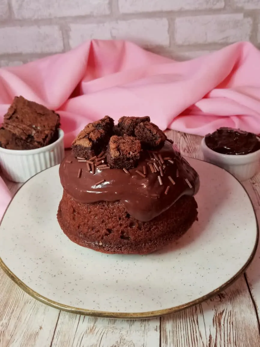 Bolo de Chocolate extremamente fofinha e bem molhadinha com pedaços de brawnie no meio pra ficar ainda mais gostoso uma calda de chocolate quentinha em cima pra finalizar brawnie em cima e granulado de chocolate pra ficar bem chocolatudo.